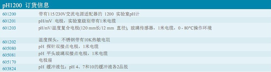 pH、氧化還原電位、溫度。pH1200可提供以YSI品質的pH或氧化還原電位的實驗室測量。圖為儀器和170電很座。