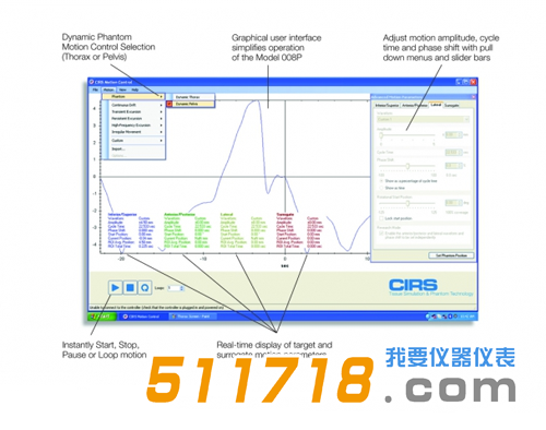 使用CIRS運(yùn)動(dòng)控制軟件獨(dú)立控制前列腺運(yùn)動(dòng)。圖形用戶界面提供無限種類的優(yōu)化運(yùn)動(dòng)配置文件,同時(shí)將Dynamic Pelvis