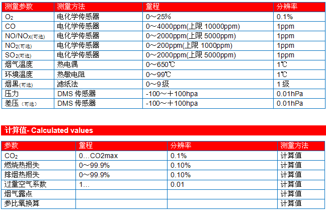 O2 (0-21%)、CO (0-4000 ppm; H2-補(bǔ)償)、NO (0-5000ppm), 空氣溫度 (0-99°C),煙氣溫度 (0-500°C),通風(fēng) (± 100 hPa),不同壓力 (± 100 hPa) 通過可選壓力管。